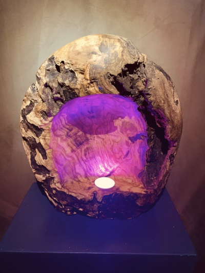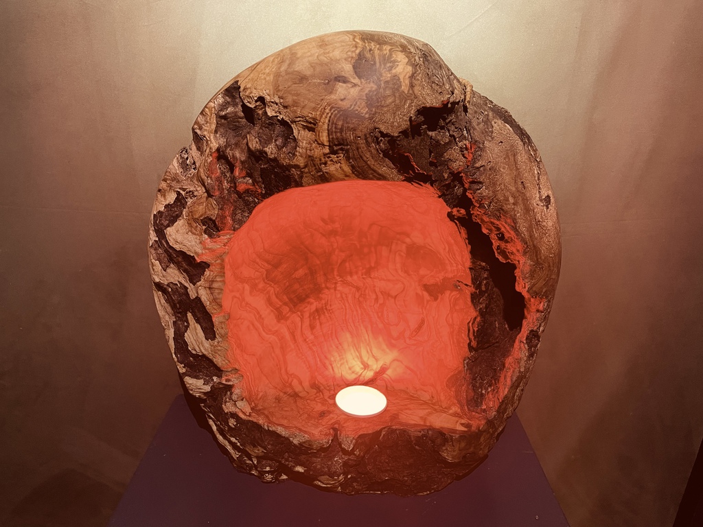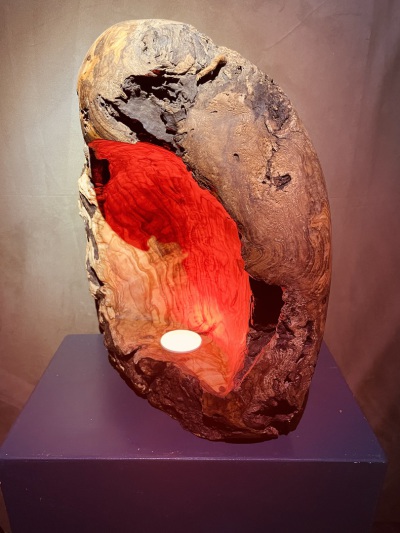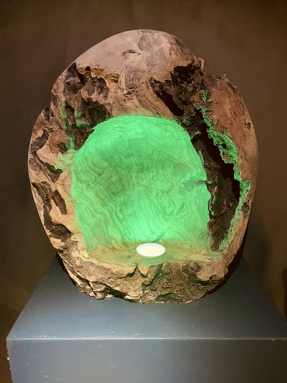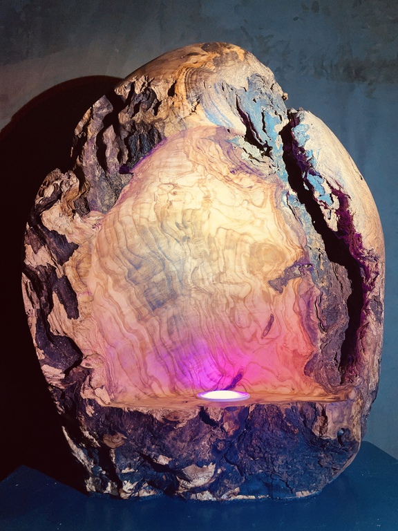 Für die Herstellung dieses Objektes wurde eine ca. 450 Jahre alte Olivenbaum-Wurzel geteilt und in aufwändiger Handarbeit ausgearbeitet. Anschließend wurde die LED-Beleuchtung installiert, was das