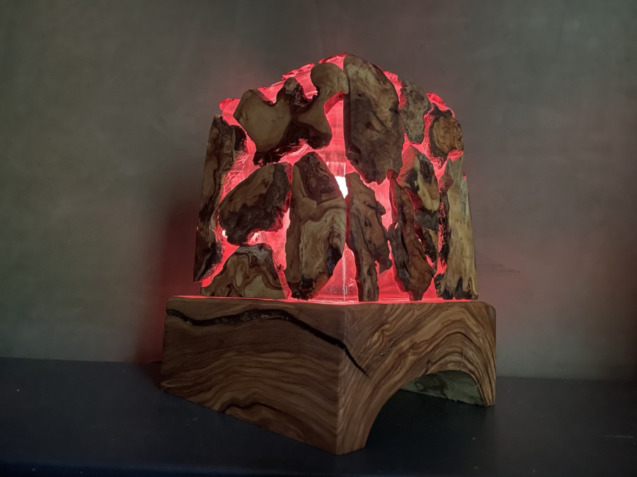 Oberfläche: Sockel und Olivenholzplättchen des Lampenglases feingeschliffen, mit Naturwachs behandelt und matt poliert.