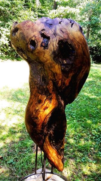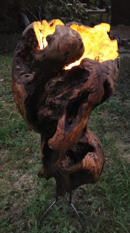 Besonderheiten: Lichtskulptur, mit ungewöhnlich facettenreicher Struktur. In der trichterförmigen Aushöhlung im oberen Bereich ist eine LED Beleuchtung integriert, die wahlweise auch farblich gestaltet werden kann. Dadurch entstehen eindrucksvolle Licht- und Schattenspiele im angrenzenden Bereich, und die Holzmaserung wird zusätzlich intensiviert.