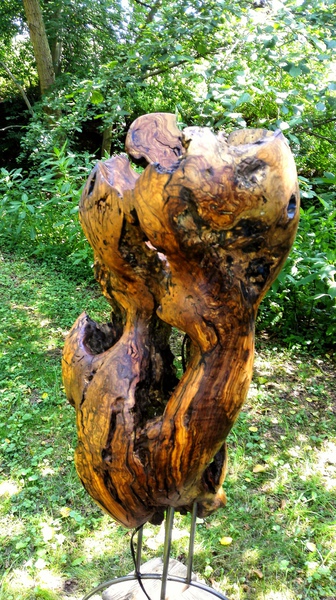Beschreibung: große, wuchtige Stand-Skulptur mit Beleuchtung (Lichtobjekt) auf 4-stäbigem Metallfuß. Dieses aussergewöhnliche Kunstobjekt lässt die Fantasie des Betrachters aus jeder Perspektive Neues entdecken. Die Skulptur entstand aus einer mehrere Meter Durchmesser großen Olivenbaumwurzel, die über viele Jahrhunderte unter der Erde gewachsen ist. Die äußerst abwechselungsreiche Struktur mit Hohlräumen, Rissen und Formen machen dieses Objekt zur lebendigen Anschauung der Natur von alten Olivenbäumen.