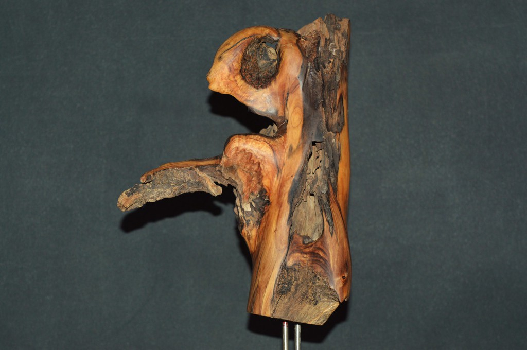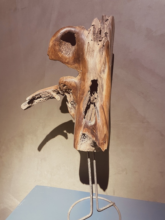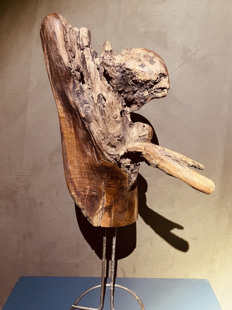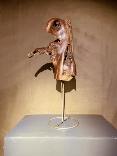 Beschreibung: Skulptur, bearbeitet und naturbelassen auf Metalldrahtgestell