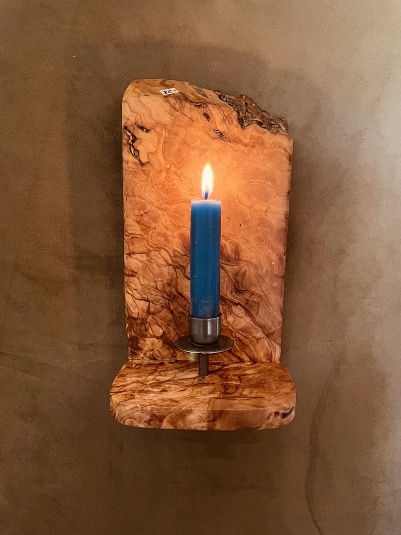 Besonderheiten: Der Leuchter überzeugt durch den teilweise unbearbeiteten und naturbelassenen Wuchs mit dere typischen Struktur von Olivenholz einerseits und durch sehr schöne Maserung auf den bearbeiteten Flächen.