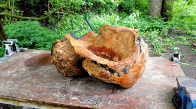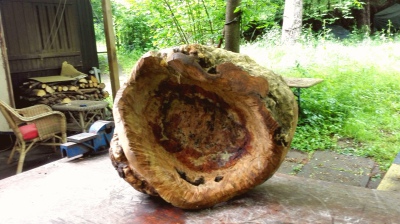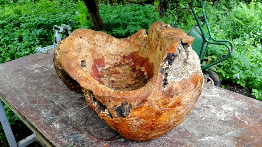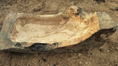Oberfläche: außen teilweise naturbelassen mit der original Aussenhaut (Rinde), sonst, wie auch innen, fein geschliffen, mit Naturwachs behandelt und matt poliert