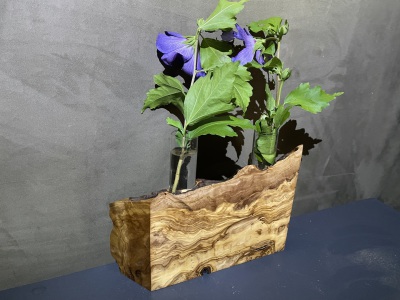 Beschreibung: Vase in uriger, skulpturaler Form mit 2 Reagenzglas-Einsätzen. Hergestellt aus feinstem Wurzelholz eines jahrhundertealten Olivenbaumes.