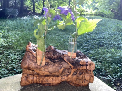 Besonderheiten: Diese aussergewöhnliche Reagenzglasvase entstand aus einem Wurzelholzstück eines uralten Oliven-baums. Die weitestgehend naturbelassene Form und Struktur des Holzes zeigen eindrucksvoll die Schönheit dieses Baumes.