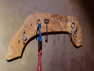 Die Schlüsselbretter Eleganta und Rootsy eignen sich besonders für die mediterrane oder auch antiquitäre Einrichtung. Sie bestehen aus ca. 500 Jahre altem Olivenbaum-Wurzelholz und heben sich mit Rissen, Auskerbungen und Unregelmäßigkeiten deutlich von üblicher Fabrikware ab. Die in 100% Handarbeit entstandenen Einzelanfertigungen sind Naturobjekte und mehr als nur Gebrauchsgegenstand, sie werden gesehen und bewundert. Die rissige, stark zerklüftete Wurzelholzstruktur mit Rindenresten korrespondiert mit intensiver Maserung und fein geschliffener Vorderseite.