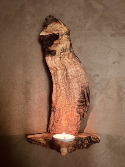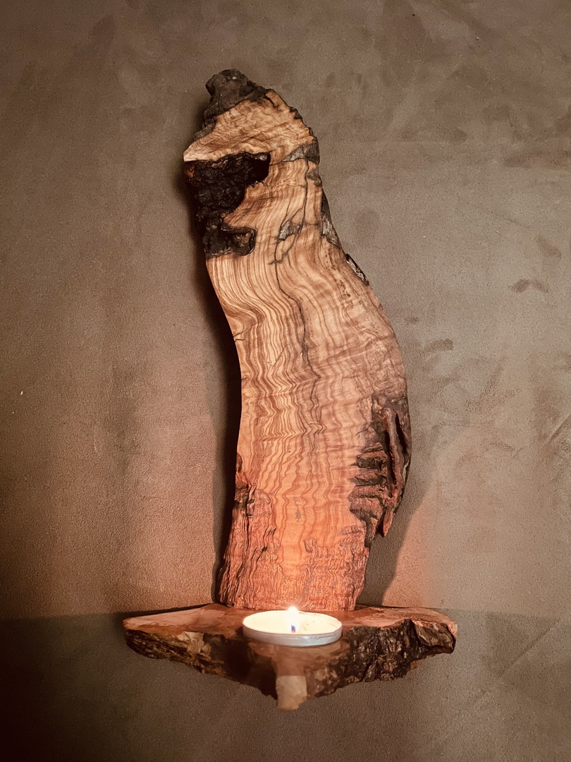 Beschreibung: Wandkerzenleuchter für Teelichter im Vintagelook gefertigt aus dem Holz eines uralten Olivenbaums. Auch sehr gut als freistehendes, dekoratives Teelicht geeignet. Es können auch Stumpenkerzen bis 3,5,cm Durchmesser verwendet werden. Inkl. rückseitigem Aufhänger.